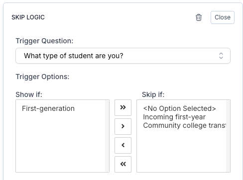 - Trigger Rules: This logic requires a defined, selectable value to act as a trigger. It is only compatible with Radio Button, Dropdown, and List question types.