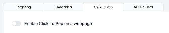 At the top of the publishing page for a form variant, you will need to click the “Click to Pop” tab, and then turn on the “Enable Click To Pop on a webpage” toggle.