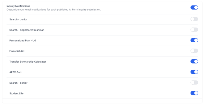 If you want to turn on Inquiry Notifications, you can turn them on for all forms or select forms. After you toggle on Inquiry Notifications, you can use the toggle next to each form name to change the notification setting for that form only.