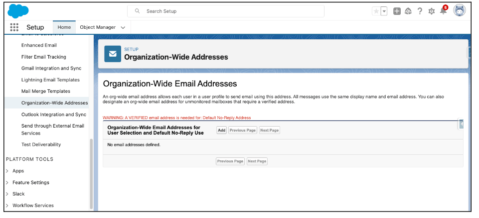 - In Salesforce, click on or search “Organization-Wide Addresses.”